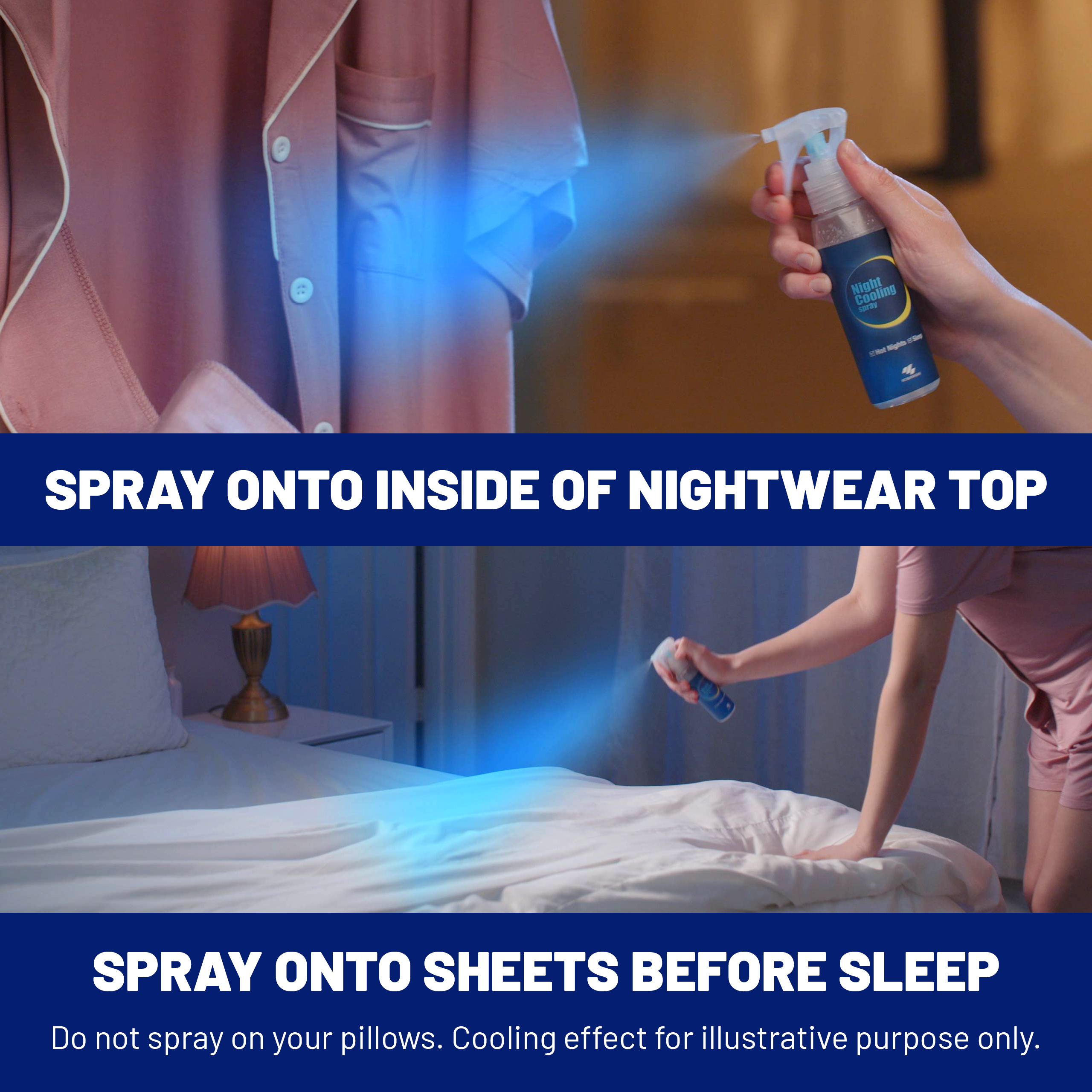 Just spray over your bed sheets, duvet and the inside of your nightwear for a cooling sensation* Do not use on your pillows/ pillowcases or over the genital area inside your nightwear.